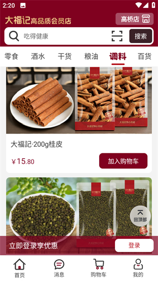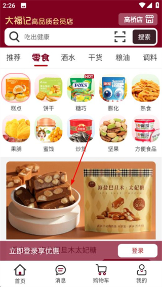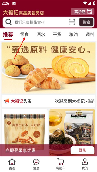 1、在大福記會員店首頁,點擊零食分類選項,進入零食專區(qū)頁面。