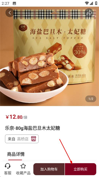 2、在零食頁面,點擊目標商品如海鹽巴旦木太妃糖,進入商品詳情頁。