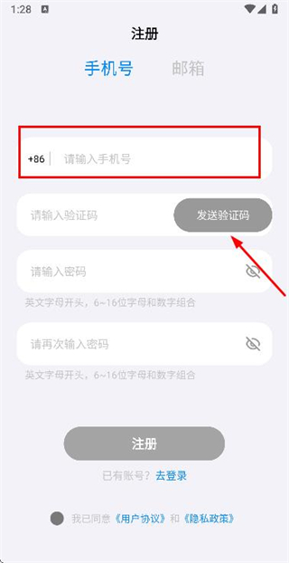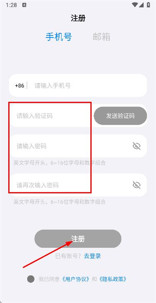 3、在注冊賬號頁面填寫驗證碼和密碼,勾選協(xié)議后點擊注冊完成賬號注冊操作。