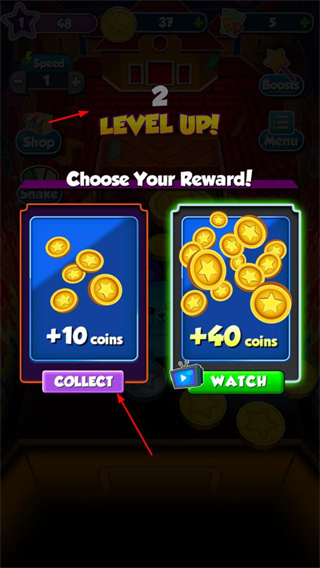 3、關(guān)卡升級(jí)后,可選擇獎(jiǎng)勵(lì)選項(xiàng)點(diǎn)擊COLLECT直接獲取少量金幣,或觀看視頻獲取更多金幣獎(jiǎng)勵(lì)。