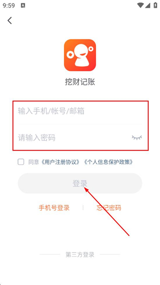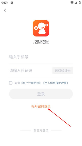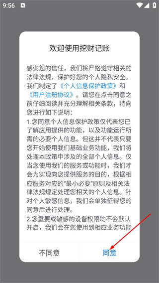 1、在挖財記賬的歡迎彈窗中,點擊同意,進入登錄選擇頁面。
