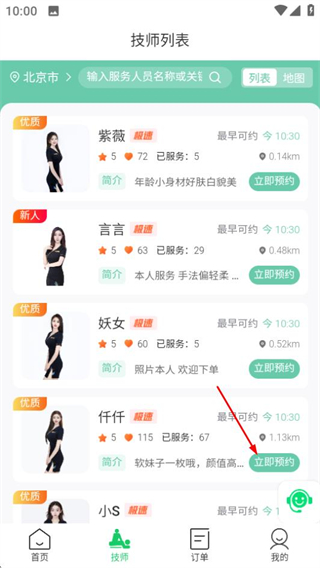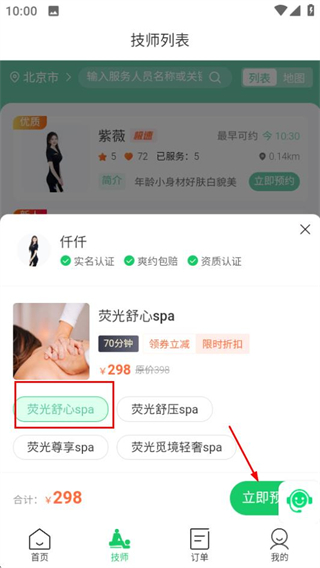 2、在技師列表頁面,選擇目標(biāo)技師后點(diǎn)擊立即預(yù)約,進(jìn)入服務(wù)選擇頁面。