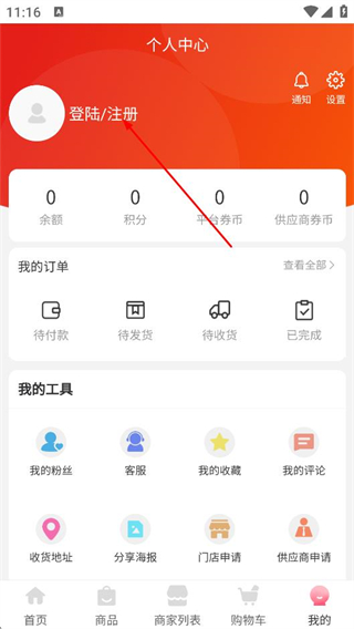 3、在個人中心頁面,點擊登陸/注冊區(qū)域,進入登錄頁面。
