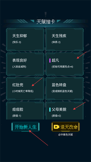 2、在天賦抽卡界面,可自行選擇三個(gè)天賦,點(diǎn)擊開始新人生進(jìn)入屬性調(diào)整。