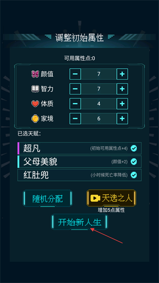 3、在初始屬性界面,確認(rèn)已選天賦對(duì)應(yīng)的屬性加成,點(diǎn)擊開始新人生開啟本次人生模擬。