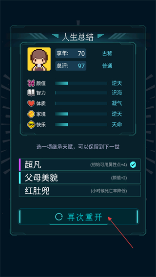 4、人生總結(jié)后,選擇繼承天賦,點(diǎn)擊再次重開開啟下一輪人生模擬,積累更強(qiáng)天賦。