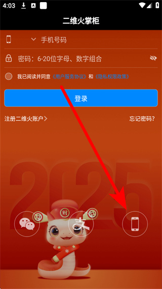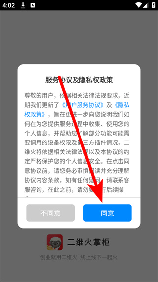 1、打開二維火掌柜,在彈窗中點(diǎn)擊同意,進(jìn)入登錄頁面。