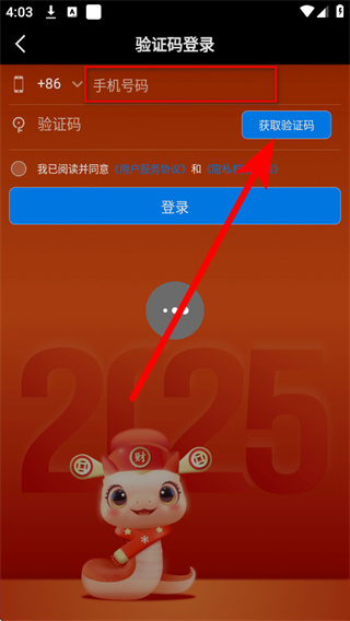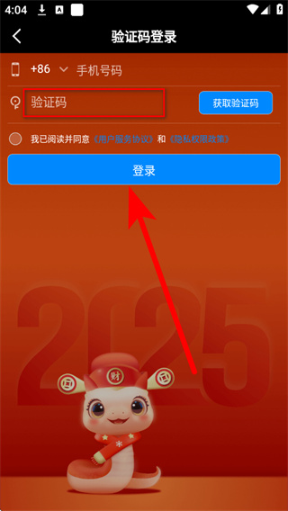 4、將收到的短信驗(yàn)證碼填入框,勾選相關(guān)協(xié)議后,點(diǎn)擊登錄完成賬號登錄。