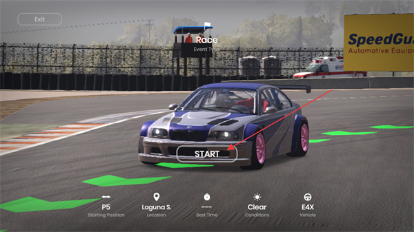 1、這是賽車賽事的啟動界面,賽事類型為Race,點擊界面中的START按鈕即可開啟本場比賽,同時可查看初始車輛與賽道信息。