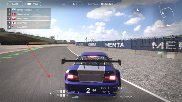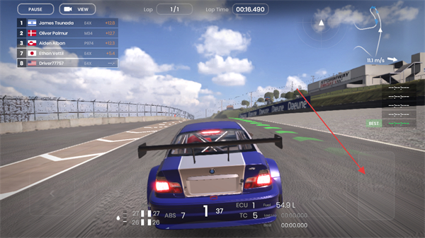 3、比賽過程中需根據(jù)實時排名調(diào)整駕駛策略,通過左下角的箭頭按鍵控制車輛轉向,借助賽道指引穩(wěn)定行駛以提升當前位次。