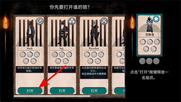 2、在船員選擇界面,點(diǎn)擊紅色箭頭指向的打開按鈕,可釋放對應(yīng)船員加入隊(duì)伍,推進(jìn)劇情。