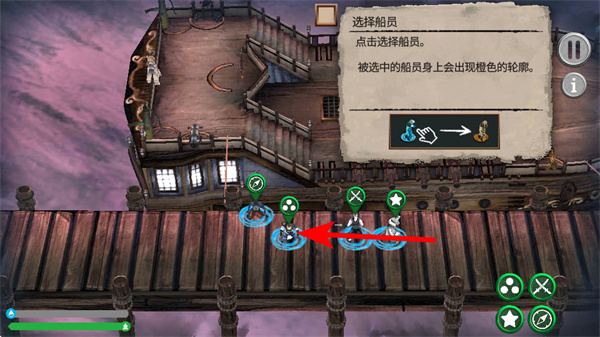 4、點(diǎn)擊紅色箭頭指向的船員,可選中該船員出現(xiàn)橙色輪廓,完成選擇船員的操作要求。