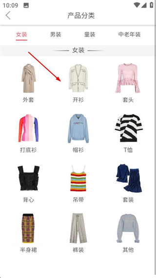 2、在產(chǎn)品分類頁面,選擇女裝下的開衫分類進入開衫商品列表頁。