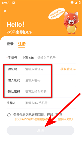 5、輸入驗(yàn)證碼和設(shè)置密碼,勾選相關(guān)協(xié)議后,點(diǎn)擊注冊,完成注冊。