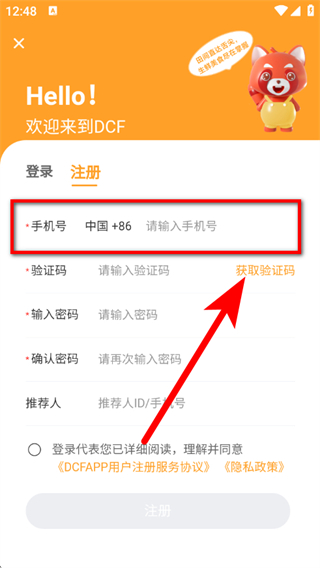 4、在注冊頁面,輸入手機(jī)號,點(diǎn)擊獲取驗(yàn)證碼。