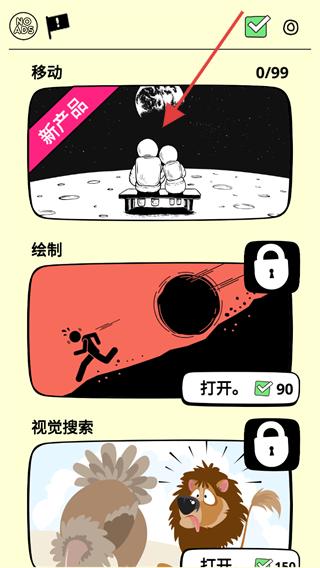 1、進入游戲界面后,找到標有移動的板塊,該板塊含新產品標識,點擊指引指向的畫面區(qū)域,可進入對應關卡選擇界面。
