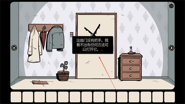 1、觀察場景,門無把手無法直接開,收集地面物品,推進解謎流程。