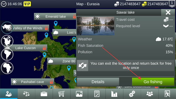 1、在Map-Eurasia界面選擇Sawailake,查看其Weather、FishSaturation等信息后,點擊Gofishing即可進(jìn)入該湖泊的垂釣場景。