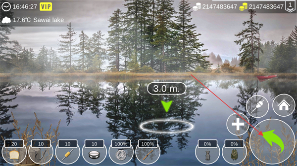2、進(jìn)入Sawailake垂釣界面后,觀察當(dāng)前垂釣深度為3.0m,點擊右側(cè)對應(yīng)按鈕可進(jìn)行拋竿操作。