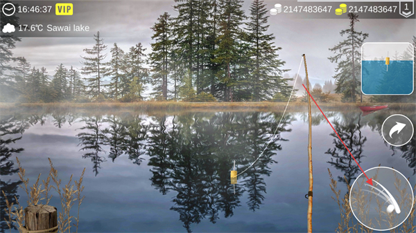 3、拋竿后觀察浮漂狀態(tài),當(dāng)浮漂出現(xiàn)異動時,點擊右側(cè)對應(yīng)的操作按鈕,即可觸發(fā)提竿動作嘗試捕獲魚類。