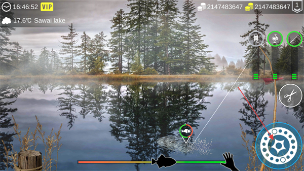 4、當(dāng)魚咬鉤后,通過操作右側(cè)的轉(zhuǎn)輪按鈕來控制收線節(jié)奏,同時留意魚類的掙扎狀態(tài),穩(wěn)定收線以成功釣獲目標(biāo)魚。