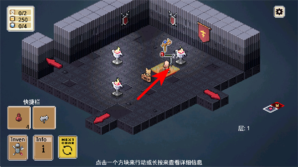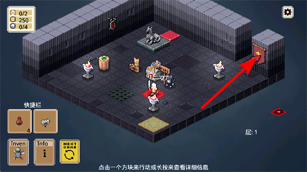 2、進入地牢場景后,點擊紅色箭頭指向的門區(qū)域,操控角色移動到該位置,開啟新的房間探索,注意觀察場景中的可交互區(qū)域,確保角色移動路徑正確。