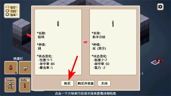 4、在裝備選擇界面中,點擊紅色箭頭指向的購買按鈕,獲取選中的裝備,提升角色的戰(zhàn)斗屬性,完成這一步操作以增強角色的戰(zhàn)斗能力。