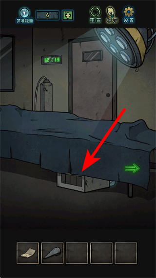 2、進入手術室場景后,點擊手術床下方的區(qū)域,這是觸發(fā)隱藏密碼箱的操作,操作后密碼箱會顯示在場景中。