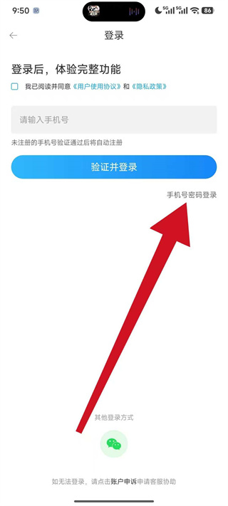 3、在登錄頁面里,點(diǎn)擊手機(jī)號密碼登錄,切換至賬號密碼登錄界面。