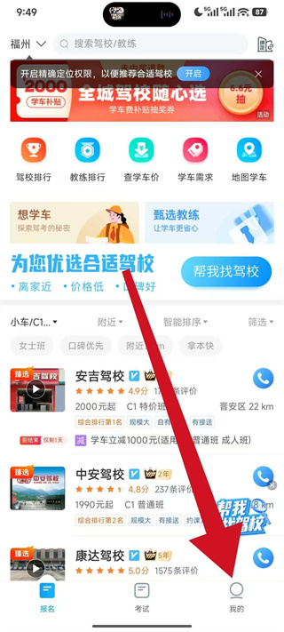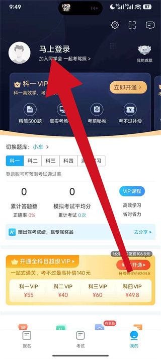 1、打開駕考寶典,進(jìn)入首頁后點(diǎn)擊底部導(dǎo)航欄的我的,進(jìn)入個(gè)人中心頁面。