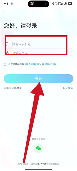 4、在密碼登錄界面,依次輸入登錄信息,勾選相關(guān)協(xié)議后,點(diǎn)擊登錄,即可完成賬號密碼登錄。