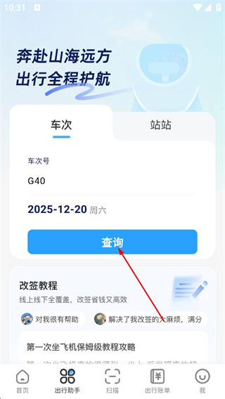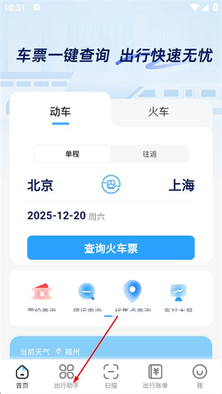 1、在車票查詢首頁,點(diǎn)擊底部的出行助手選項(xiàng),進(jìn)入出行助手頁面。