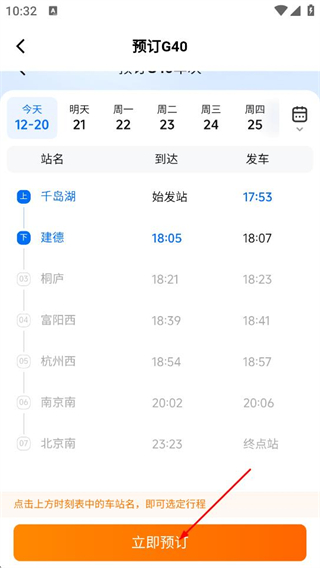3、在車次預(yù)訂頁面,查看站點(diǎn)時(shí)刻后點(diǎn)擊立即預(yù)訂按鈕,進(jìn)入預(yù)訂詳情頁面。