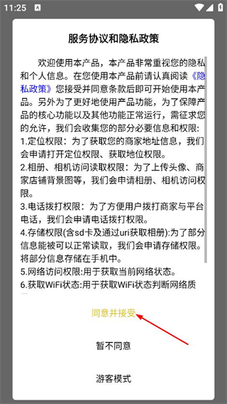 1、在服務(wù)協(xié)議和隱私政策彈窗中,點擊同意并接受,進入樂響您家的登錄頁面。