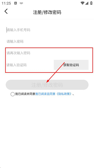 4、在注冊/修改密碼頁面,繼續(xù)填寫密碼,并填寫驗證碼,點擊注冊,完成賬號注冊流程。