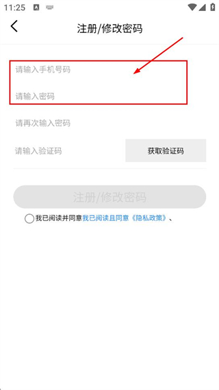 3、在注冊/修改密碼頁面,先填寫請輸入手機號和請輸入密碼對應(yīng)的信息,進行下一步。