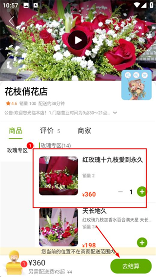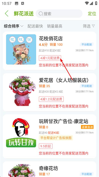 2、在商家列表頁(yè)面選擇花枝俏花店,進(jìn)入該店鋪商品頁(yè)面。