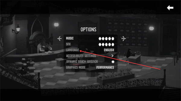 2、這是死亡之門的OPTIONS界面,可調(diào)整MUSIC、SFX等設(shè)置,找到LANGUAGE選項即可準(zhǔn)備切換游戲的顯示語言。