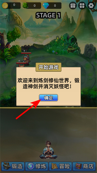 1、進入煉劍修仙游戲界面后,點擊紅色箭頭指向的確定按鈕,關閉歡迎提示彈窗,正式進入游戲的修仙場景。