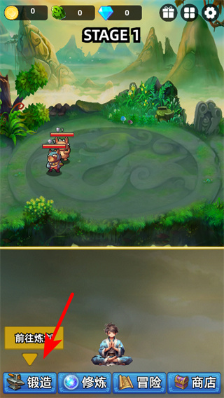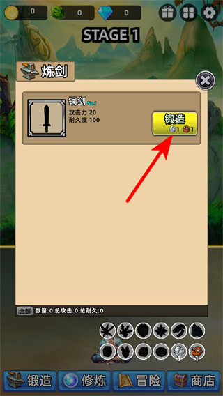 4、在煉劍界面中,點擊紅色箭頭指向的鍛造按鈕,消耗初始資源打造銅劍,獲取第一把武器,提升角色的攻擊力屬性。