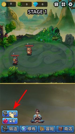 3、在主界面中,點擊紅色箭頭指向的煉劍選項,打開煉劍功能界面,解鎖武器鍛造的玩法,推進修仙進程的第一步。