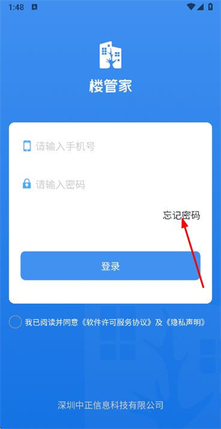 1、在樓管家登錄頁面點(diǎn)擊忘記密碼選項(xiàng),進(jìn)入忘記密碼頁面。