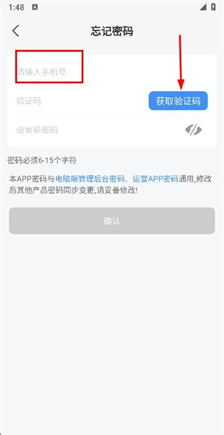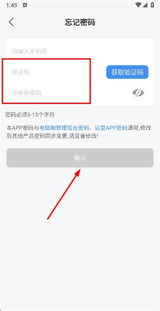 3、在忘記密碼頁面輸入驗(yàn)證碼、設(shè)置新密碼后,點(diǎn)擊確認(rèn)按鈕完成密碼修改。