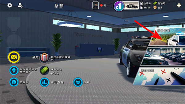 1、進(jìn)入游戲總部界面后,點(diǎn)擊紅色箭頭指向的開放世界選項(xiàng),進(jìn)入開放世界的探索玩法,這是開啟游戲核心流程的關(guān)鍵操作。