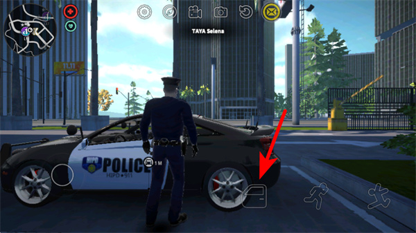 2、進(jìn)入開放世界場(chǎng)景后,點(diǎn)擊紅色箭頭指向的車輛交互按鈕,進(jìn)入警車駕駛模式,熟悉載具的操控方式,為后續(xù)任務(wù)做準(zhǔn)備。
