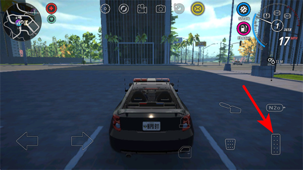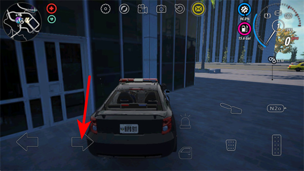 3、駕駛警車時(shí),點(diǎn)擊紅色箭頭指向的油門按鈕控制車輛前進(jìn),同時(shí)配合方向鍵調(diào)整行駛路線,在開放世界中移動(dòng)探索。