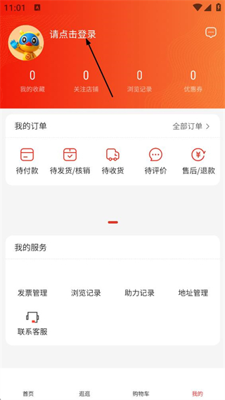 2、在我的頁面,點擊頂部的請點擊登錄區(qū)域,進入登錄頁面。
