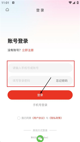4、在賬號登錄頁,填寫手機號或賬號和登錄密碼,點擊登錄,完成賬號登錄。