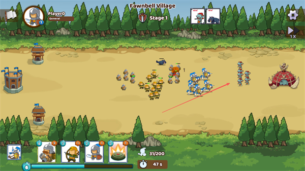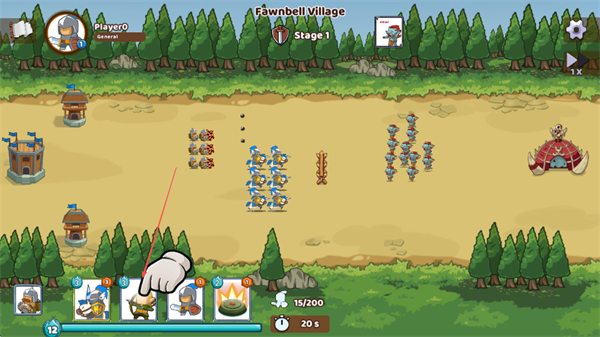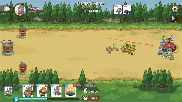 1、在FawnbellVillage的Stage1中,點(diǎn)擊底部兵種圖標(biāo)召喚士兵,部署至戰(zhàn)場(chǎng)。