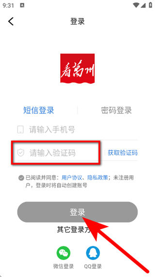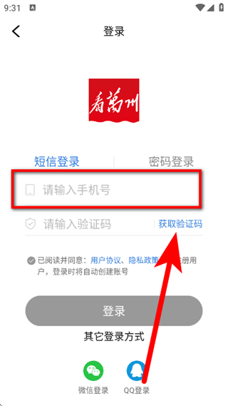 3、在短信登錄頁面,輸入手機號,點擊獲取驗證碼。